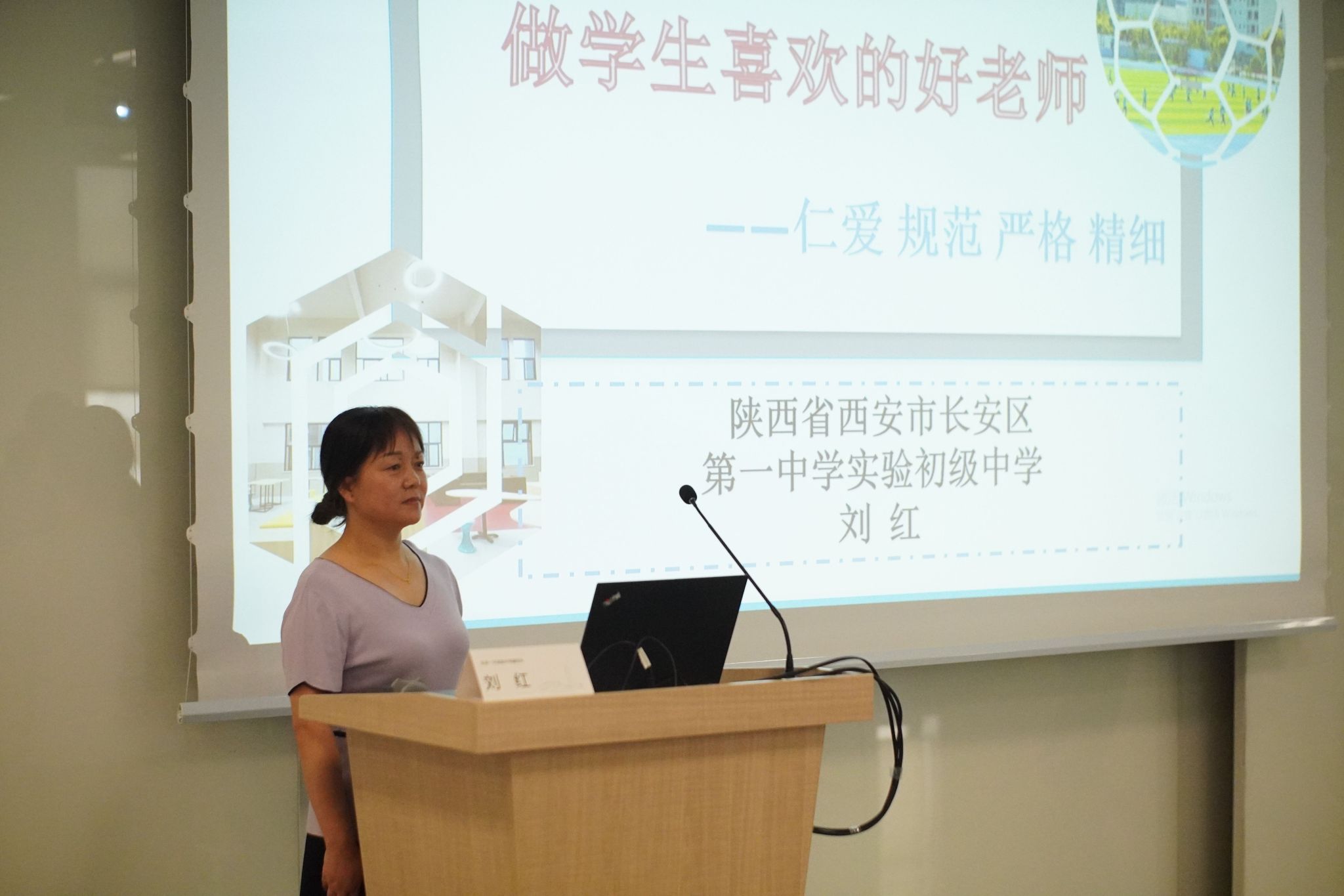 西安市长安区第一中学实验中学副校长、高级政治教师、长安区师德标兵、长安区首批名师、西安市师德先进个人、西安市年度教育人物、西安市学科带头人、西安市模范教师、陕西省优秀教师、陕西省教学能手、陕西省学科带头人刘红以《做学生喜欢的好老师》为主题,结合自己的成长经历及感悟,从教师专业成长及学生管理两个方面通过讲故事的方式,引导教师们在教育教学过程中依法依规,坚持仁爱、规范、严格、精细的管理方式,践行教育家精神,做学生喜欢的好老师。