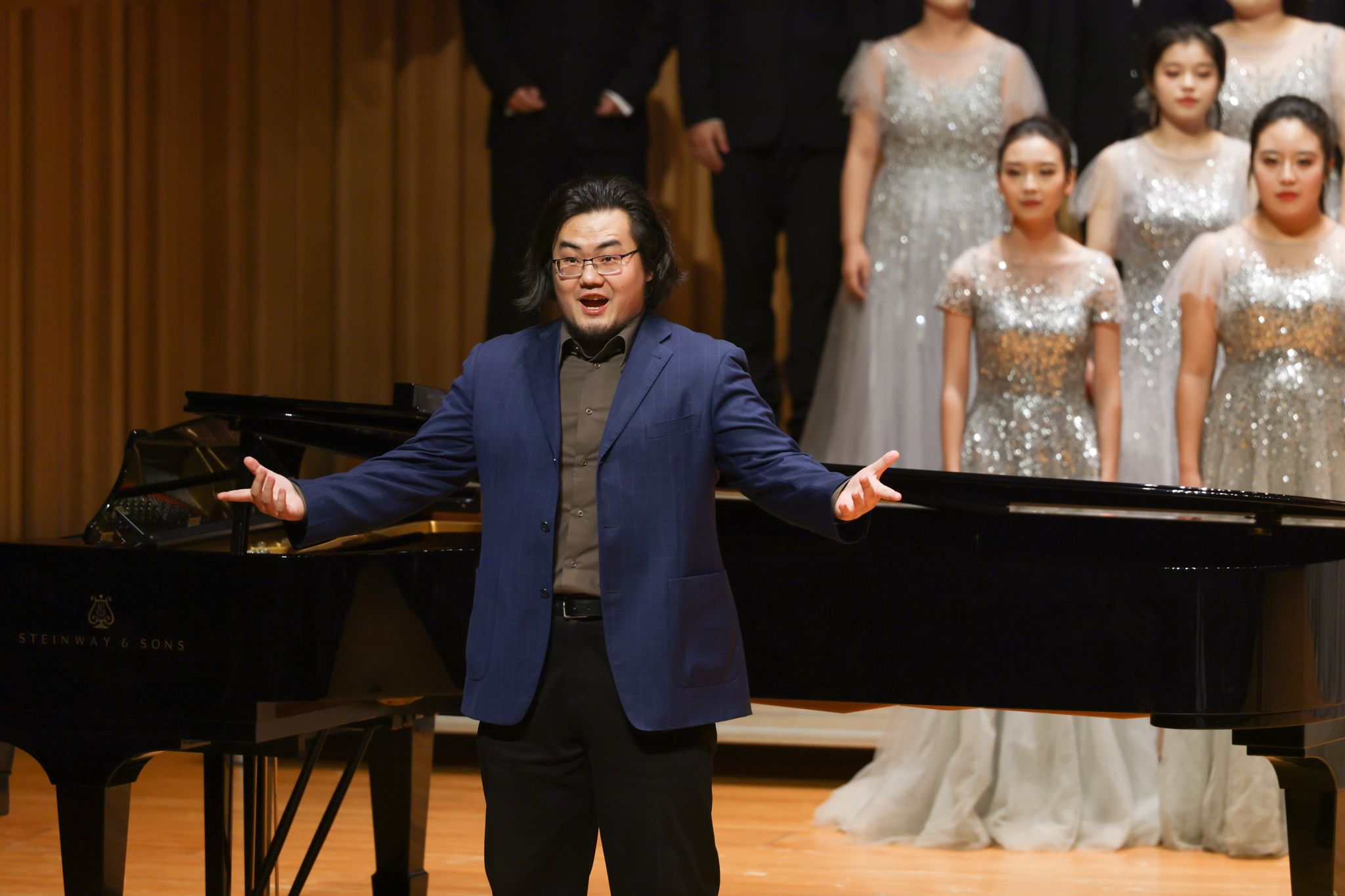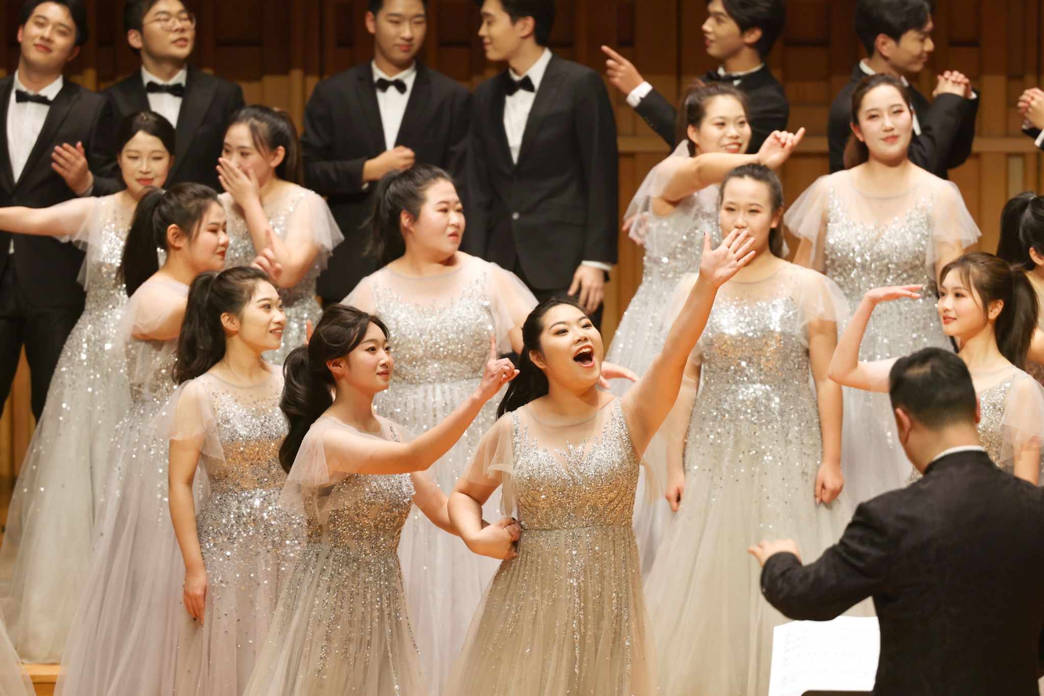 出发之前,一堂诙谐幽默的《声部介绍歌》“小课堂”提前上线。当诡异的BGM响起,舞台上各个声部便开始了“明争暗斗”的戏码,女高音、女中音、男高音、男低音的成员们相互“较劲”,生动有趣的对话,让舞台下“爱凑热闹”的观众们欢笑不停,还学到了不少音乐知识。