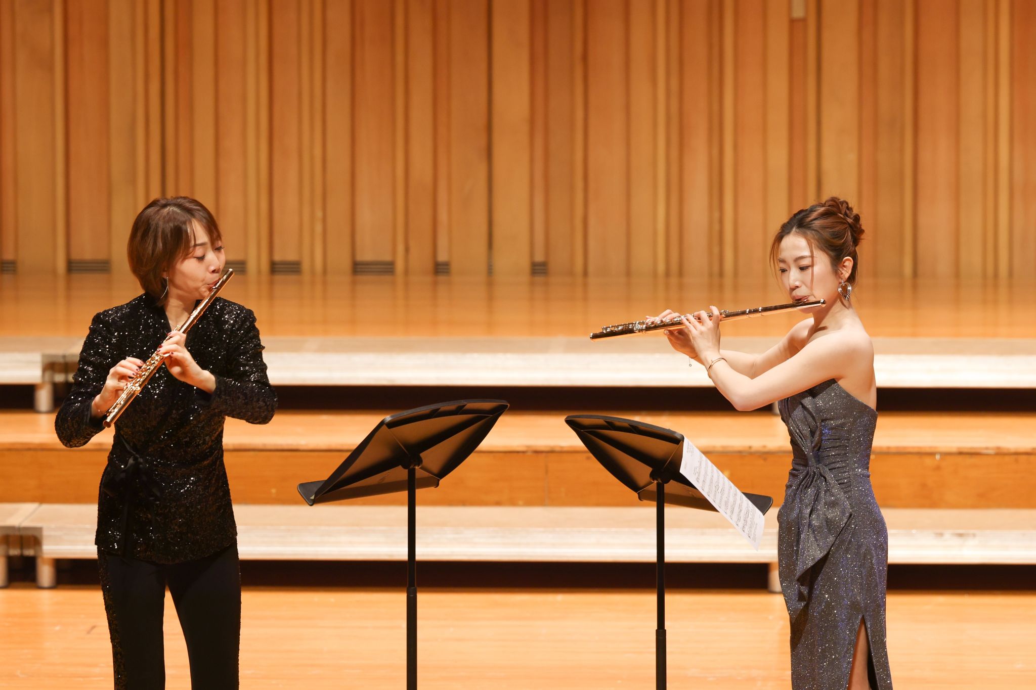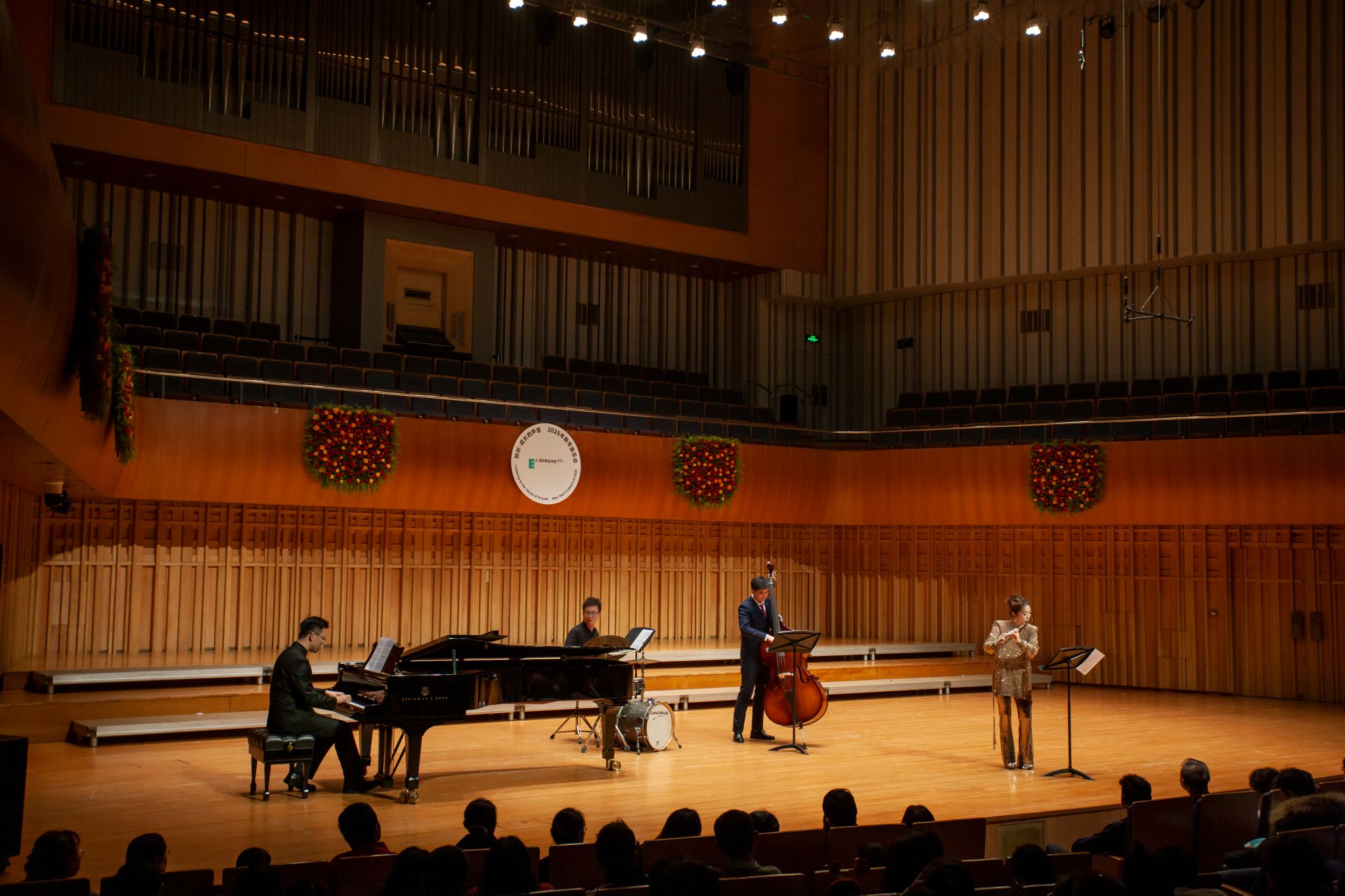 合唱间隙,通识教育学院牛一童老师和她的朋友们带来乐器演奏,让观众们身临其境感受到古典音乐的优雅气质和爵士乐的随性洒脱。《花之圆舞曲》出自柴可夫斯基创作的第三部舞剧《胡桃夹子》,改编后的长笛二重奏版本突出了长笛清新灵动的音色,两支长笛如翩翩起舞的精灵,时而交替演奏主旋律与副旋律,时而和声衬托,将柴可夫斯基经典作品中的浪漫与细腻展现得淋漓尽致。