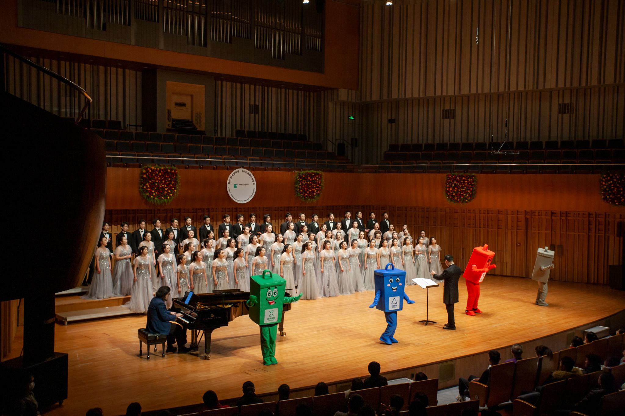 学会感知美、欣赏美,更要懂得用双手创造美。合唱尾声的这首《红蓝黄绿超给力》,为音乐会增添了一份环保主题气息。“蓝色是魔法师,把腐朽变宝贝;绿色是自然回馈,送去田野里做最营养的肥;红色的是超人,危险交它处理;黄色的是精灵,让山川河流不再哭泣……”生动形象的合唱,还有舞台上四个“垃圾桶玩偶”的可爱舞蹈,将垃圾分类的理念传递给现场每一位观众。