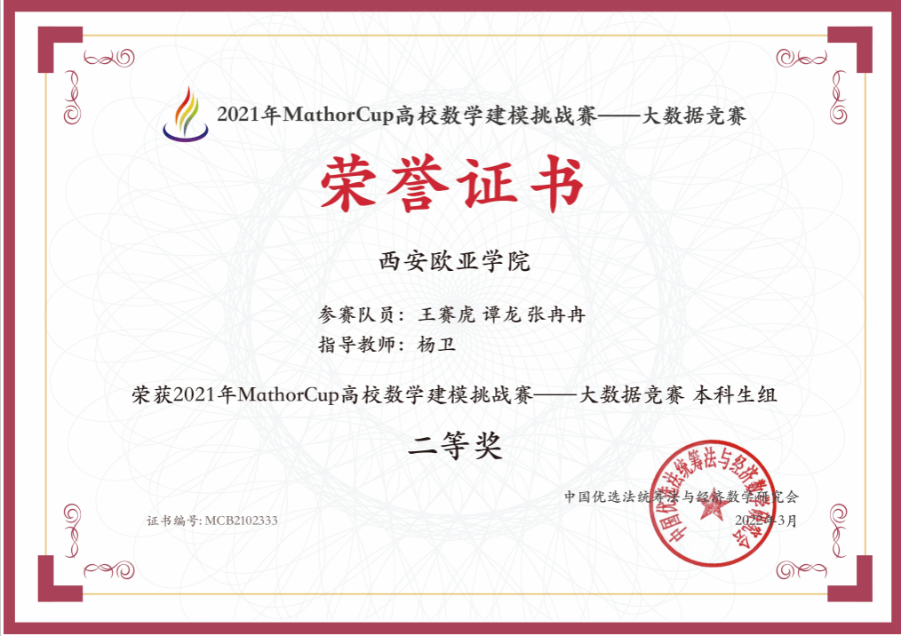 王赛虎,西安欧亚学院金融与数据科学学院数据科学与大数据技术专业2023届省级优秀毕业生。在校期间曾获国家奖学金、国家励志奖学金、全国大学生数学建模竞赛本科组陕西赛区二等奖、美国大学生数学建模竞赛三等奖、MathorCup高校数据建模挑战赛-大数据竞赛本科生全国二等奖、第十一届职业生涯规划赛二等奖等多项荣誉。同时也是校级学习标兵、校级优秀学生干部、校级荣誉学生,在校期间发表学术论文两篇,其中一篇被EI数据库收录。目前已正式入职苏州大禹数字文化科技集团有限公司,担任大数据分析师,工作中表现出色,去年11月荣获集团月度优秀员工称号,获得同事领导的一致好评。