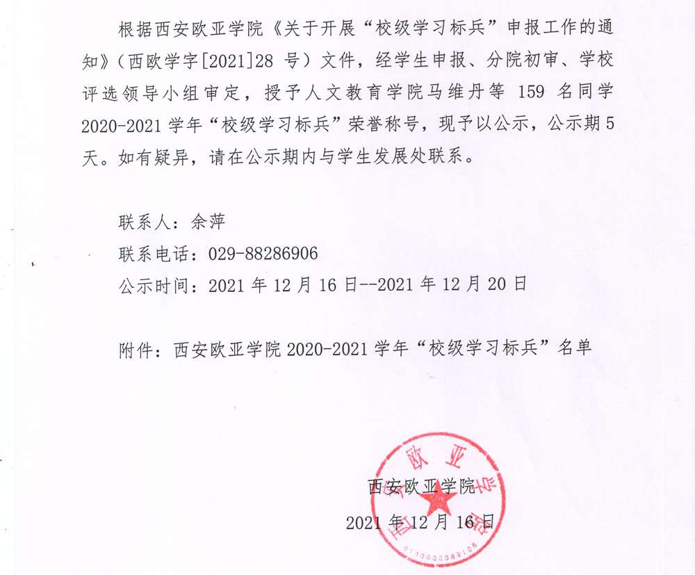 西安欧亚学院2020-2021学年“校级学习标兵”名单公示
