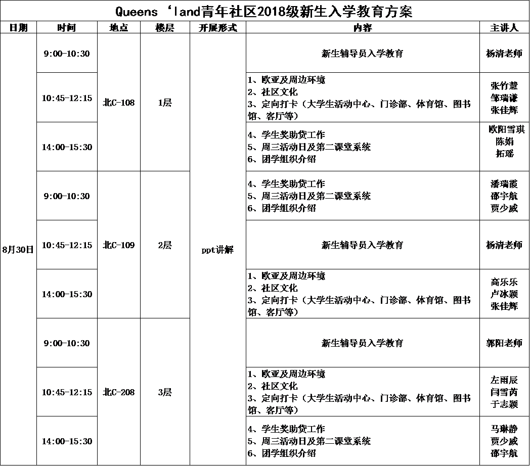 现将2018年8月30日Queens’ land青年社区2018级新生入学教育安排通知如下,请各位2018级新生周知,要求每位新生携带《入学教育签到卡》提前入场。