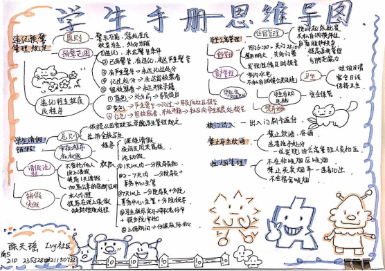 接下来,欢迎来到思维奇幻园解锁第二个版块!思维导图是小萌新们的魔法导览员,一起遨游在《2023级学生手册》中,让小萌新们在知识地图中轻松游走。在导生的引导下,通过思维导图的绘画,可以让小萌新们快速了解学校的各种规章制度,掌握新知识,适应新环境。