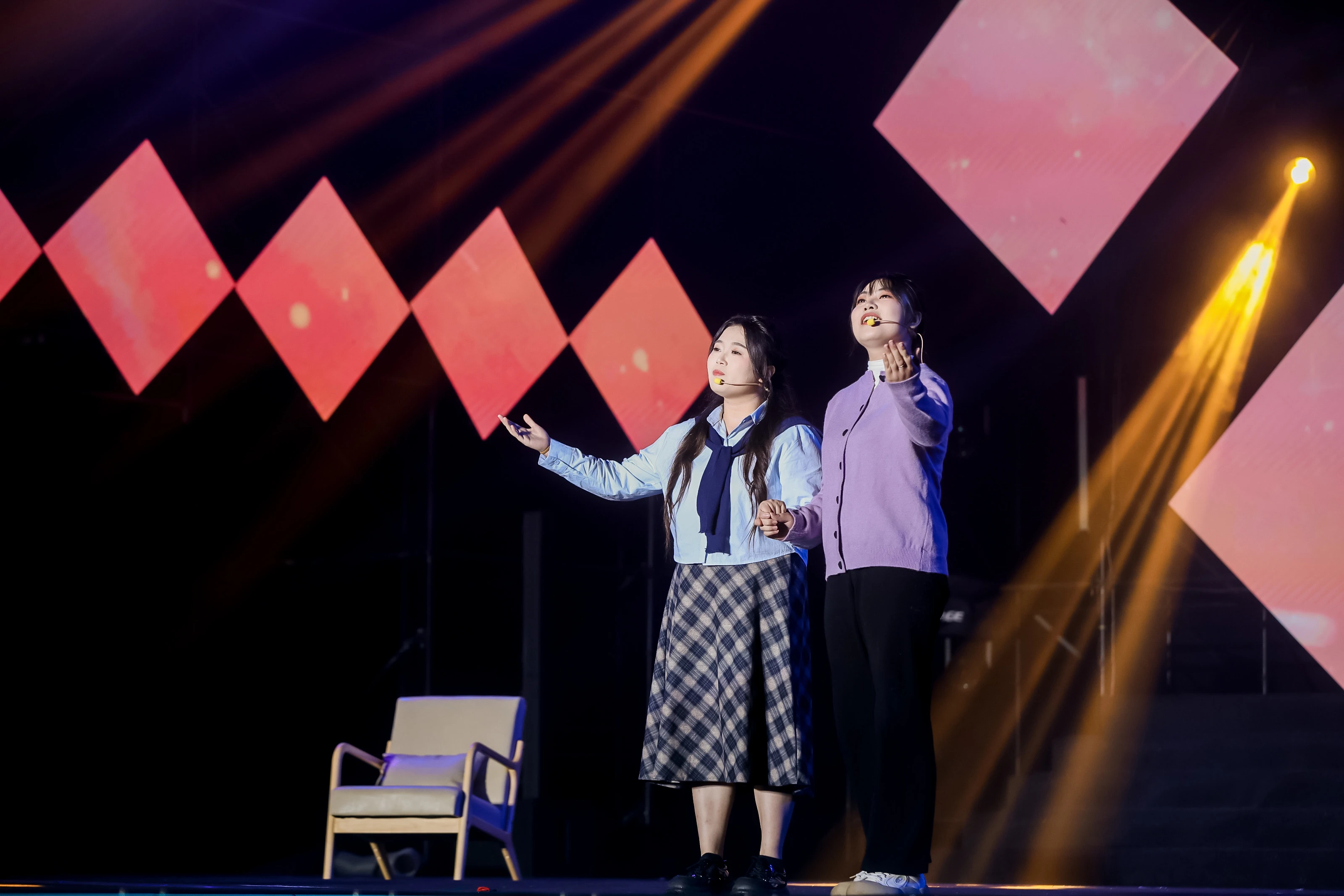 在璀璨的灯光下,现场迎来了晚会的高潮——“传递梦想,助力成长”。会计学院会计学专业主理人谢晓妮、人文教育学院学前教育专业主理人高田幸子、人居环境学院土木工程专业主理人芦白茹、职业教育学院新闻学和新闻采编与制作专业主理人王喆,为我们传递梦想。