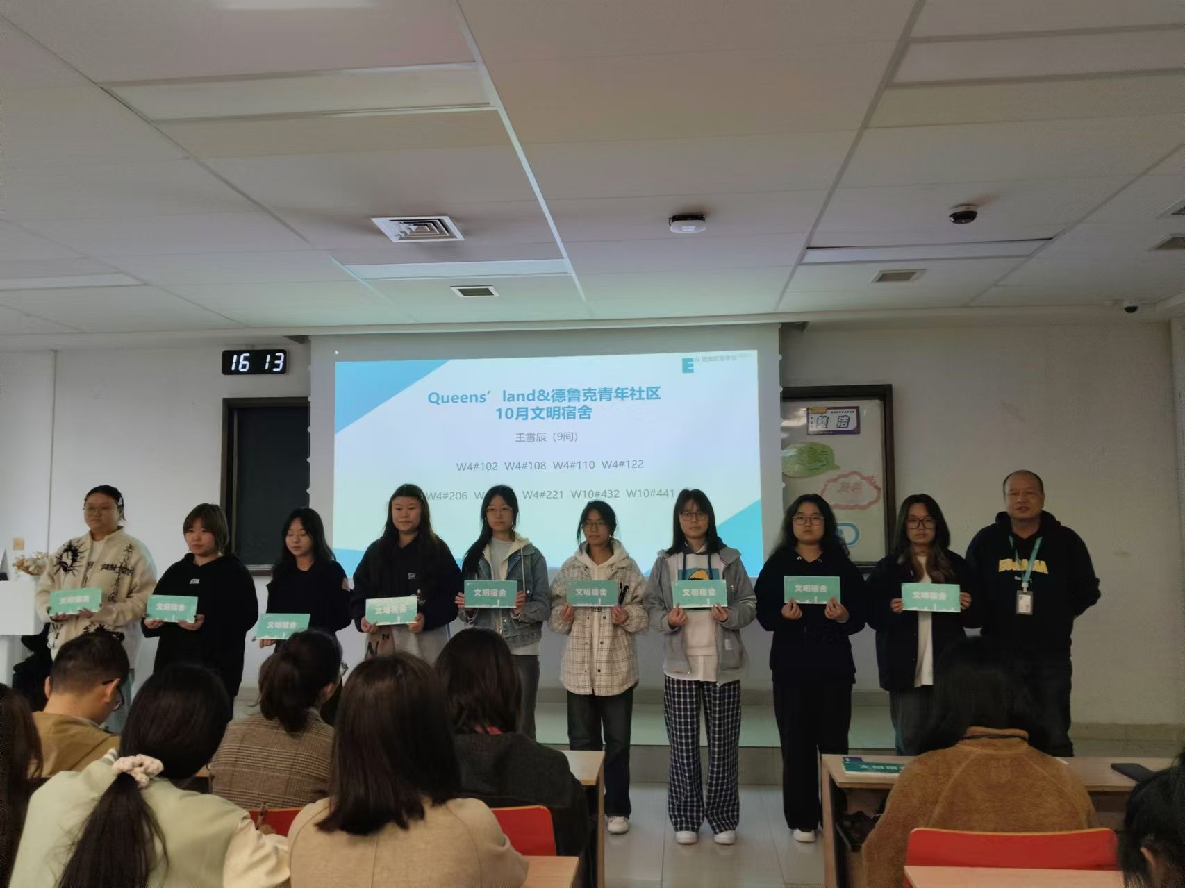 其次颁发的是月度文明宿舍。本月依然是按照辅导员所带楼层进行表彰。在颁奖过程中,辅导员不仅是荣誉的见证者,也是学生们生活上的好朋友。他们见证了文明宿舍从制定宿舍公约到共同努力,最终实现目标的全过程。文明宿舍的荣誉不是终点,而是一个新的起点。希望获得表彰的宿舍能够保持这种良好的行为习惯,不仅要在宿舍内部营造一个温馨、和谐的生活环境,还要将这种正能量传递给更多的同学,影响和带动整个校园的文明建设。