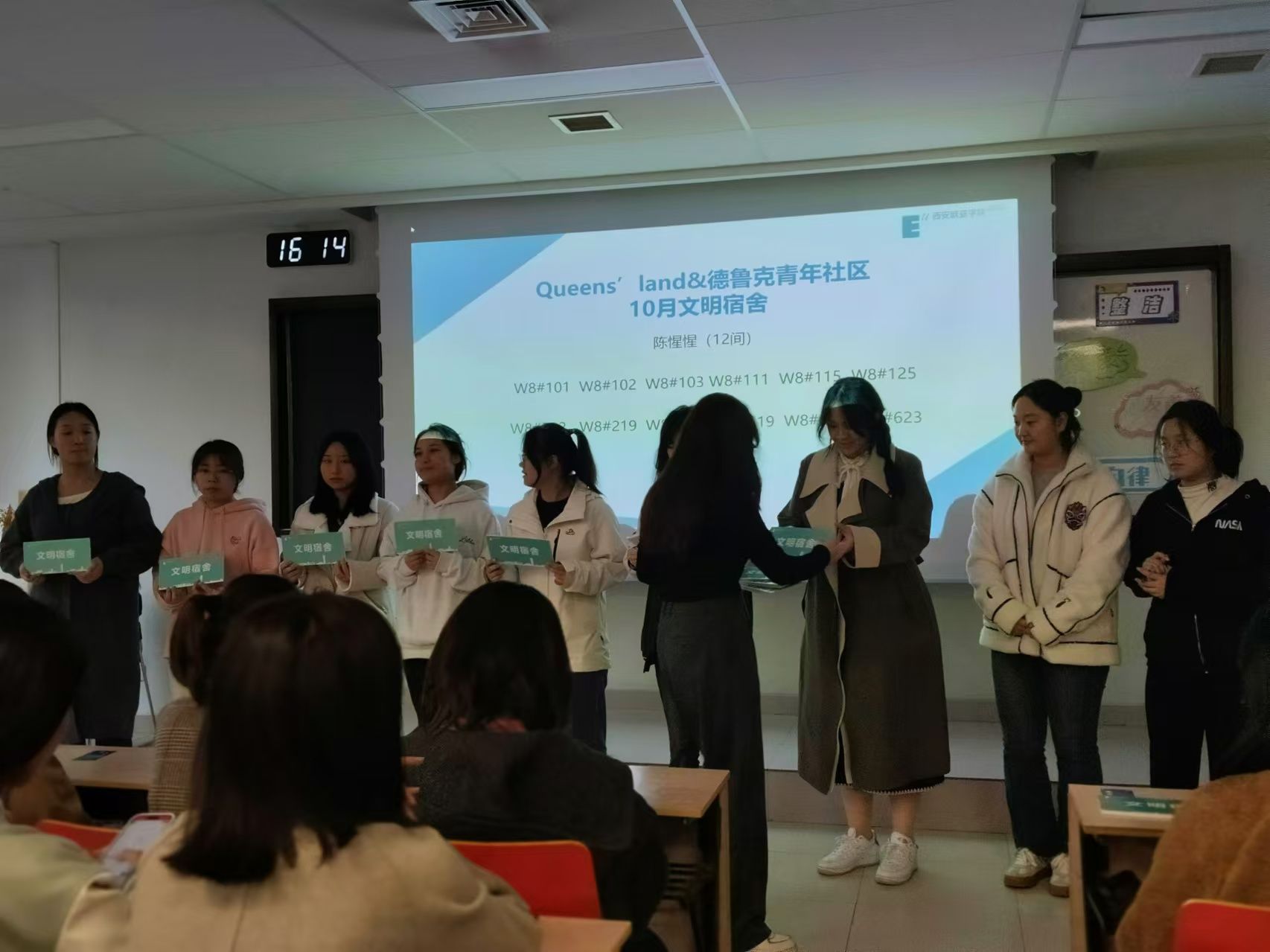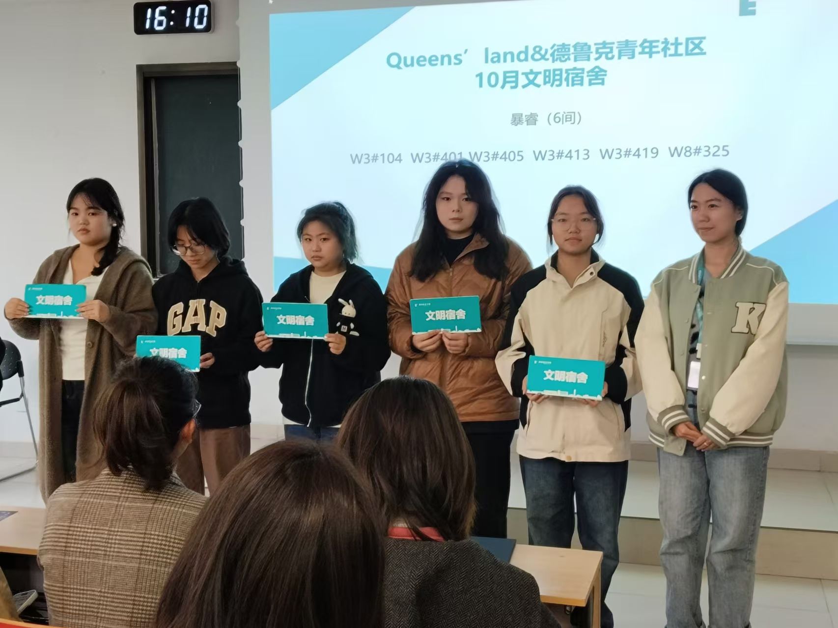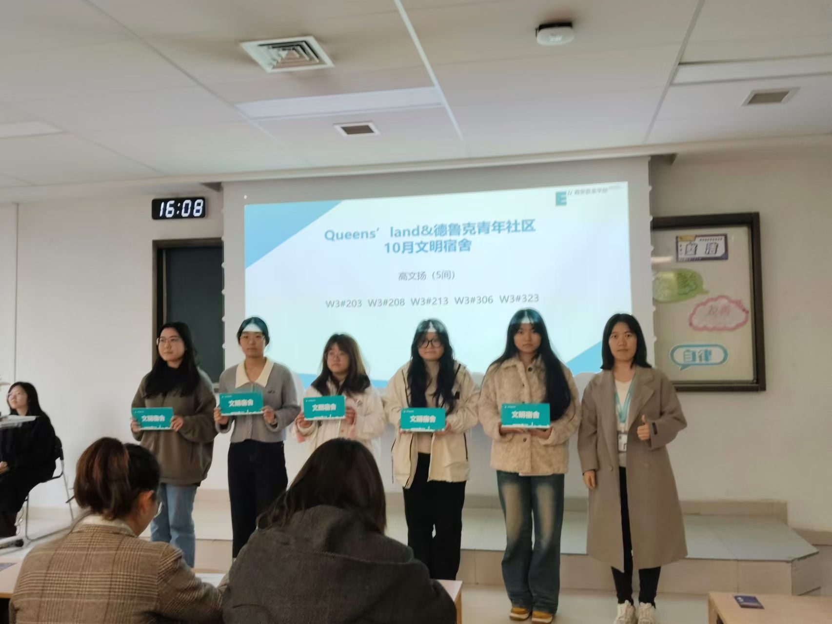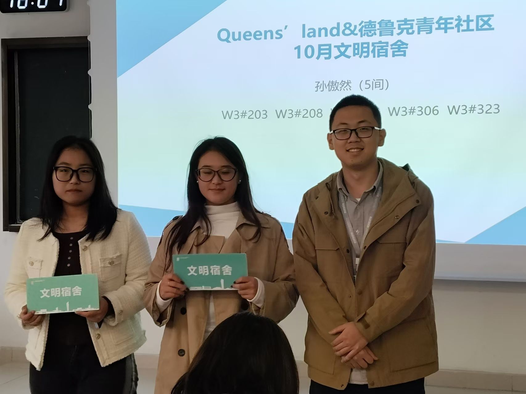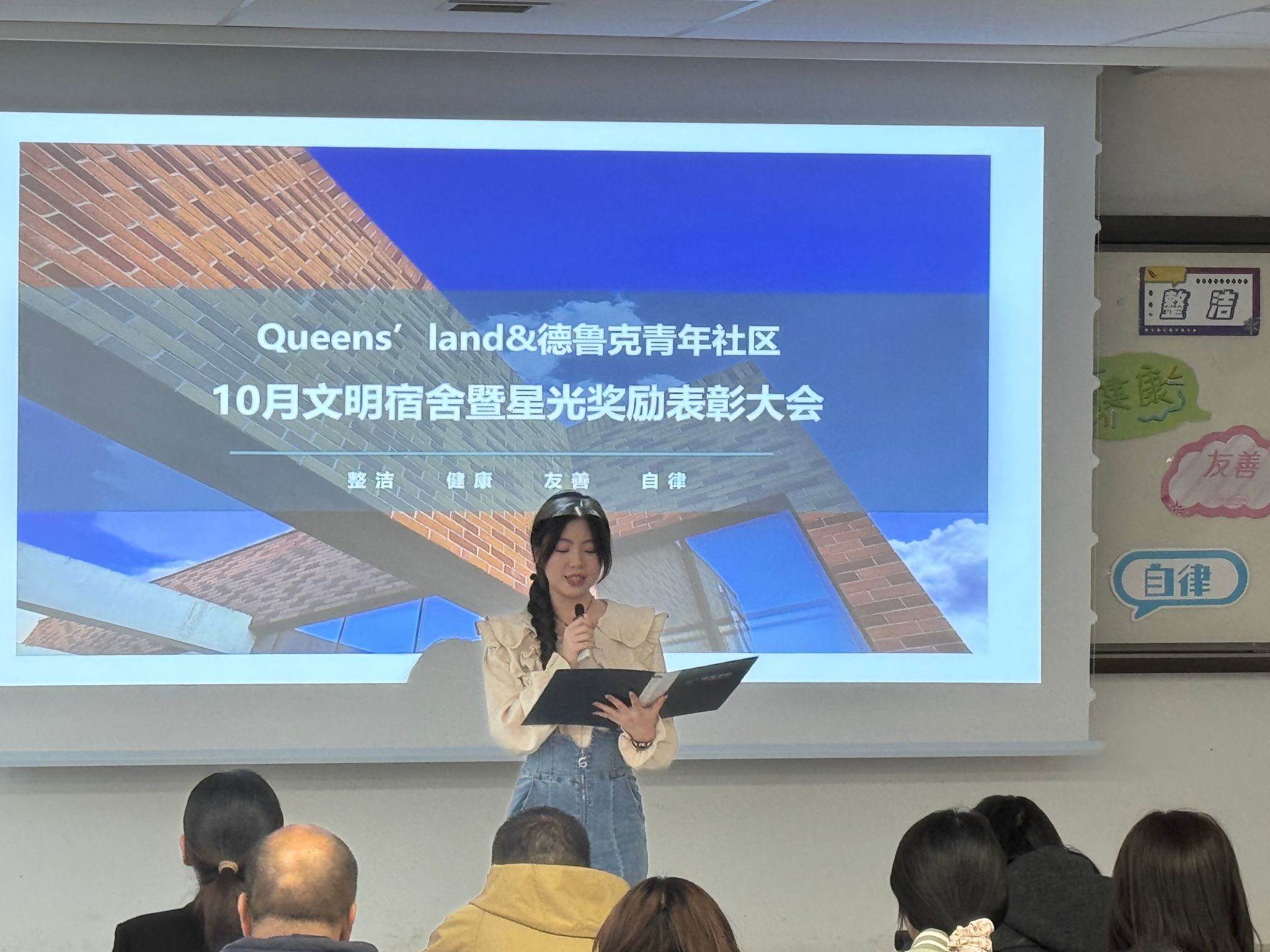 立冬悄然而至,2024年11月7日立冬这一天,寒意渐浓,但在北C308却洋溢着温暖与热情。Queens’land和德鲁克青年社区100余名师生齐聚于此,共同迎来了10月文明宿舍暨星光奖励表彰大会。本次大会由Queens’land青年社区杨昕曈同学主持。