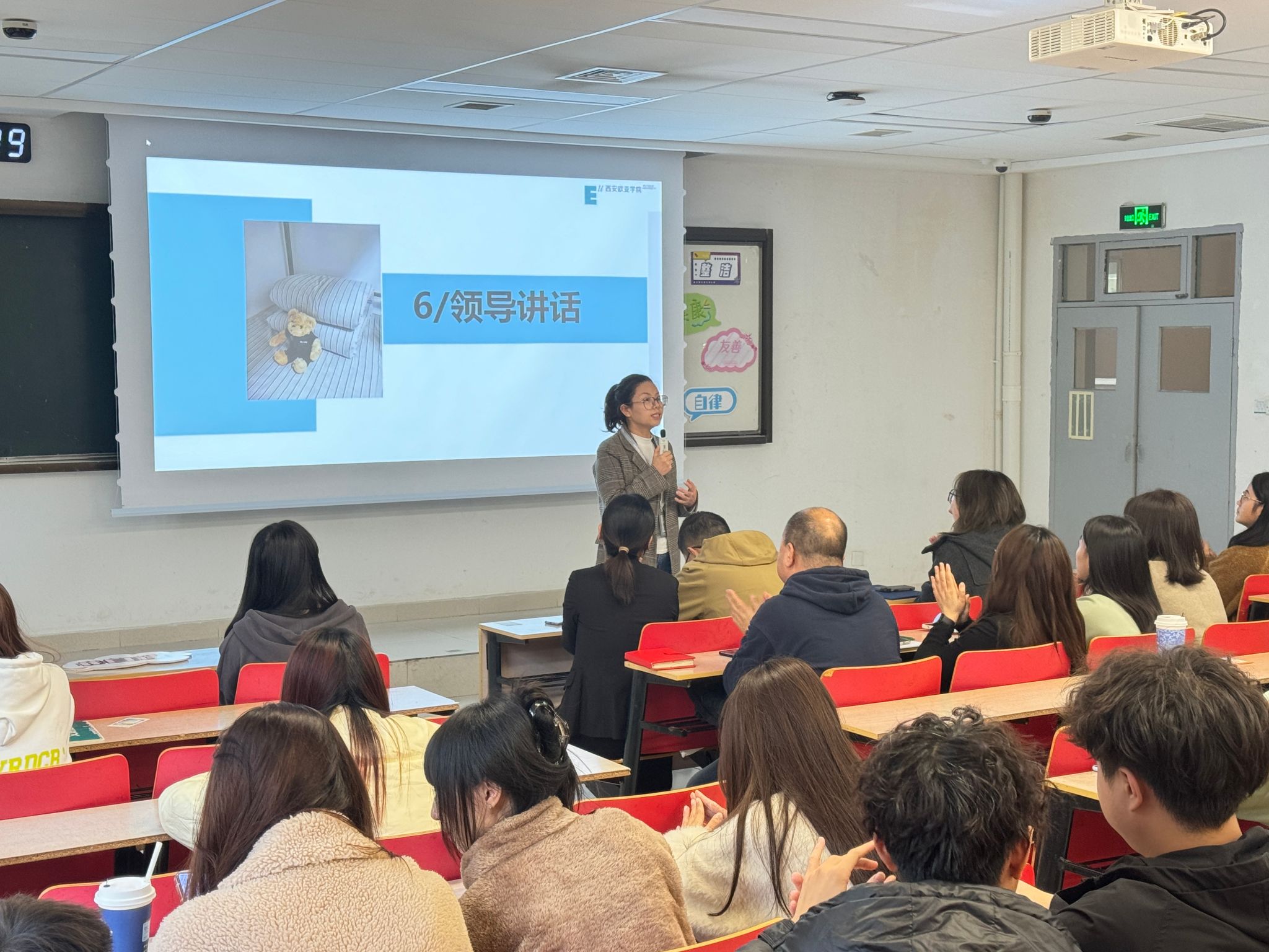 大会最后一项,社区主管白利宁老师对大会进行了总结,在我们的校园生活中,宿舍是一方独特的小天地,它承载着我们的欢笑、梦想与成长。每一个文明宿舍,都是大家共同努力的成果,是青年社区共享价值观的生动展现。学校为同学们精心定制了专属社区共享价值观——“整洁、健康、友善、自律”,这四个词不仅仅是口号,它们是行动的准则,它如同明亮的灯塔,指引着同学们共建美好社区。近期,学校更进一步提出了青年社区共享价值观的十个一,为校园生活注入新的活力与内涵。希望同学们在榜样的激励下,用行动绘就自己的校园生活画卷。