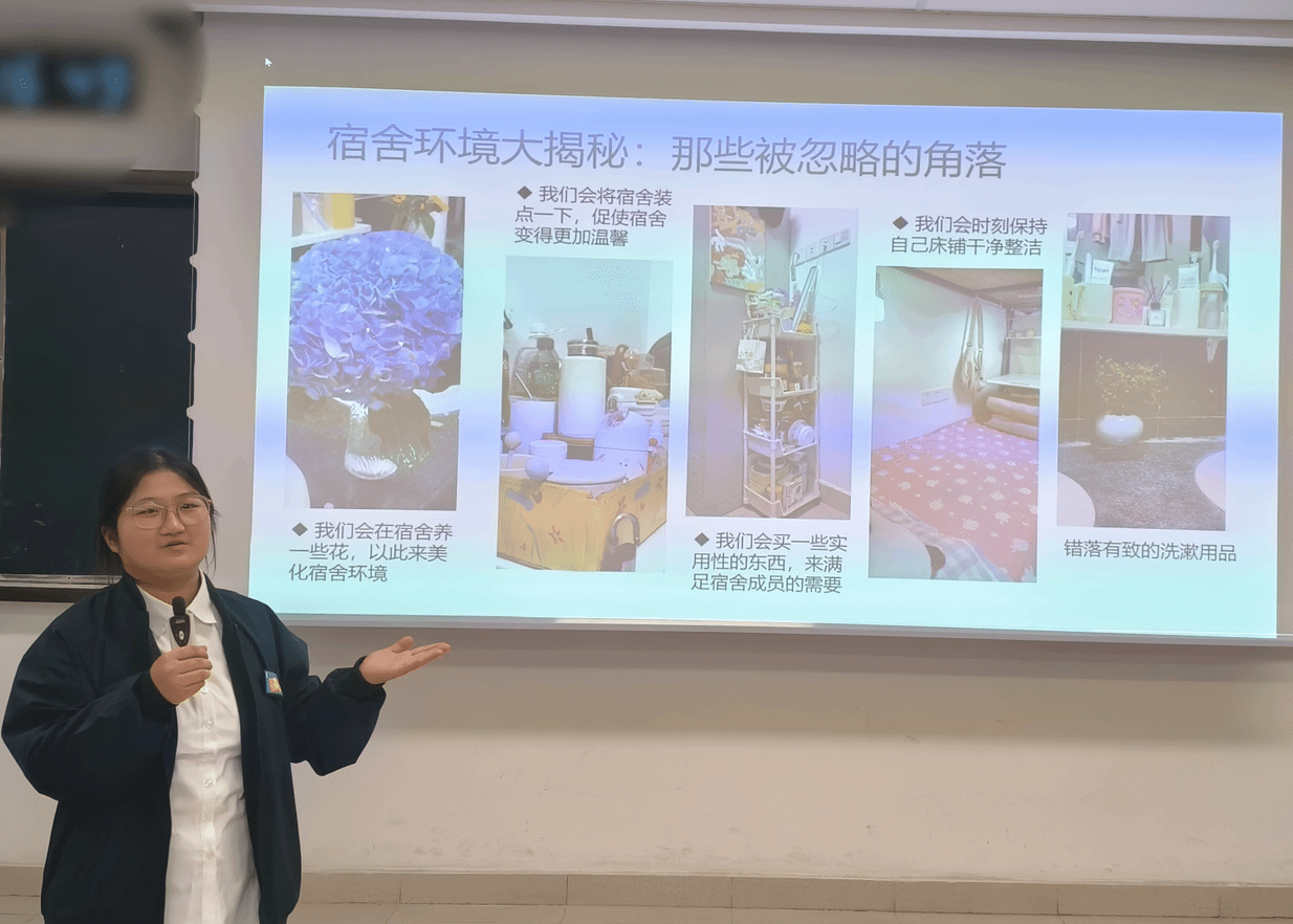 大会第三项文明宿舍代表分享经验。德鲁克青年社区W3#401符文静同学和Queens’land青年社区W2#404崔颖同学分享了各自宿舍干净整洁的秘诀——勤打扫,重保持。宿舍的每一位成员都积极参与到日常的清洁工作中,无论是每日的小扫除还是每周的大扫除,大家都会齐心协力,确保宿舍的每个角落都干净整洁。此外,他们也提到了保持宿舍整洁的重要性不仅仅在于环境的美化,更在于它能够促进宿舍成员间良好关系的建立。同时她们还分享了他们如何通过宿舍公约来规范行为,确保每个人都能为维护共同的生活环境出一份力。