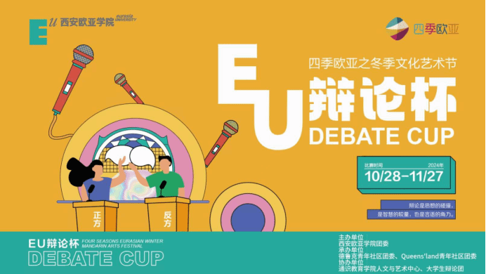 为提高学生的思辨能力和写作能力、语言表达能力和团队协作能力,营造校园文化氛围,由西安欧亚学院团委主办,德鲁克青年社区和Queens'land 青年社区承办,通识教育学院人文与艺术中心与大学生辩论团协办2024年四季欧亚之冬季文化艺术节——EU辩论杯;历时一个月,经过初赛、半决赛和决赛,最终,EU辩论杯在北A-222全景教室圆满落幕。