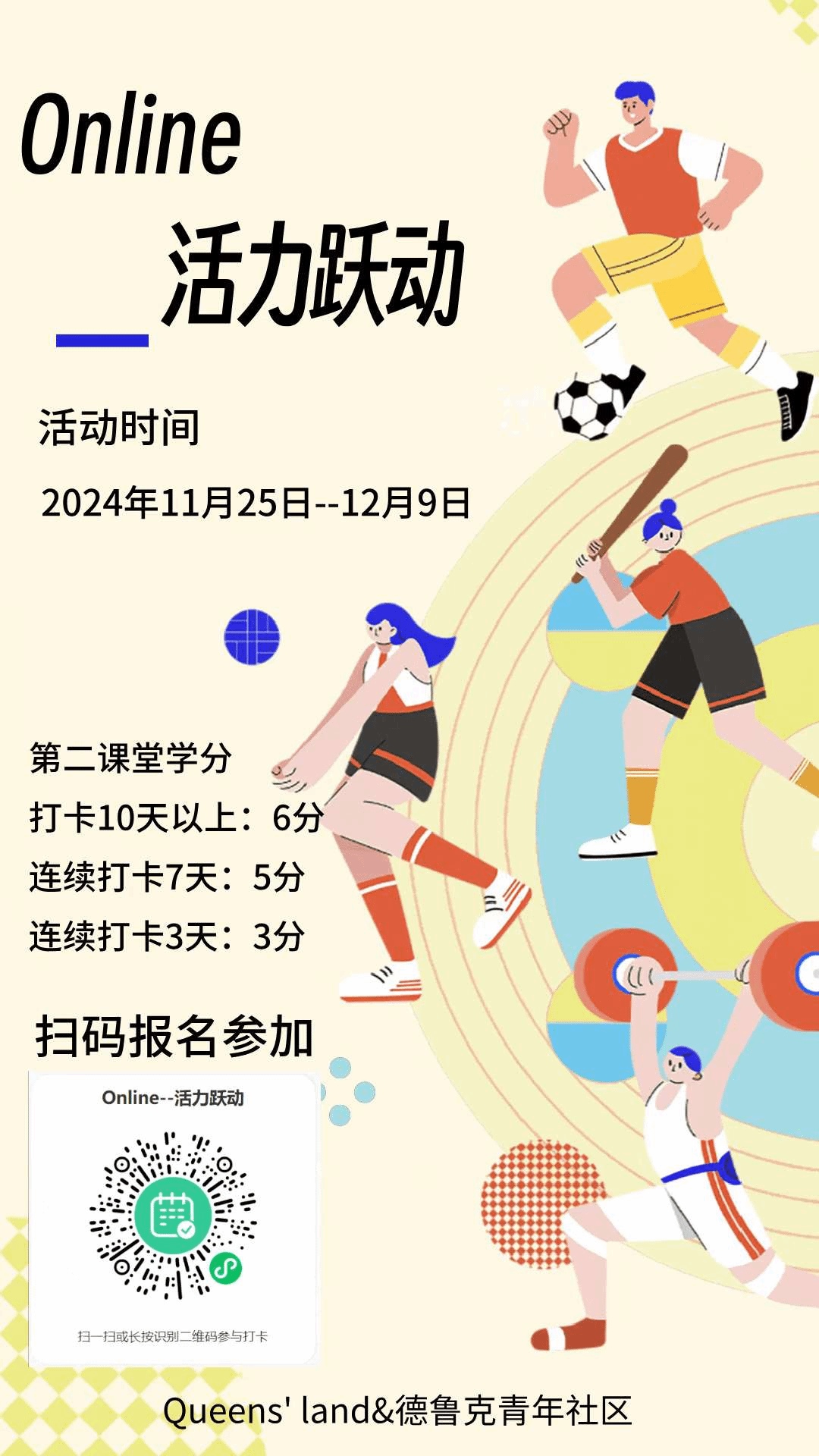 运动,是青春的节拍;活力,是生命的韵律。为贯彻落实青年社区共享价值观,提高同学们对运动的热情和参与度,增强团队意识和自我管理能力,Queens'land&德鲁克青年社区开展了Online“活力跃动”线上运动打卡活动。在这里,我们不仅追求身体的强健,更追求心灵的飞扬和生活的多彩,让活力成为习惯,让健康成为常态。