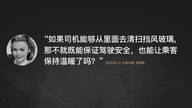 于是,她拿起了随手的笔记本,即刻开始画起来,你猜她画出了什么?没错,她画出了世界上第一个雨刮器。(创新的力量)