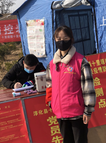 (魏晨蕾同学在检测口进行测量进出村民体温等工作)
