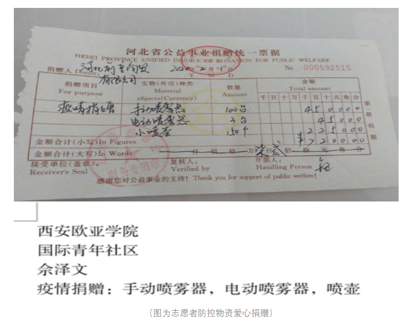 佘泽文同学,国际青年社区学生,在这场没有硝烟的战役中,和父母向河北省公益事业捐赠100台手动喷雾器、3台电动喷雾器 以及150个喷壶。他说:“医护人员在前方奋力救援,我们在后方也一定要做些什么。”疫情无情人有情,一方有难八方援。