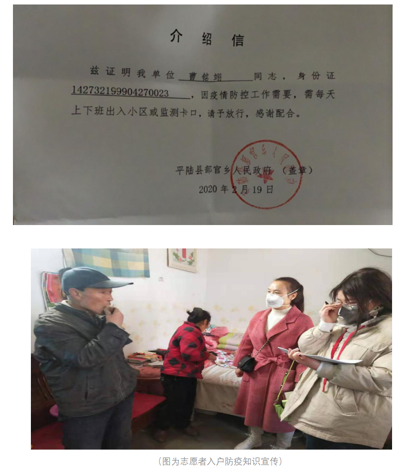 曹铭翊,国际青年社区学生,也是一名入党积极分子,此时的她,更是平陆县部官乡人民政府的一名疫情防控志愿者。面对这场防疫战,主动报名参加对街坊邻居进行疫情知识宣传,以及对居民们日常体温测量。她说希望自己的小小力量能为疫情防控做一份贡献。