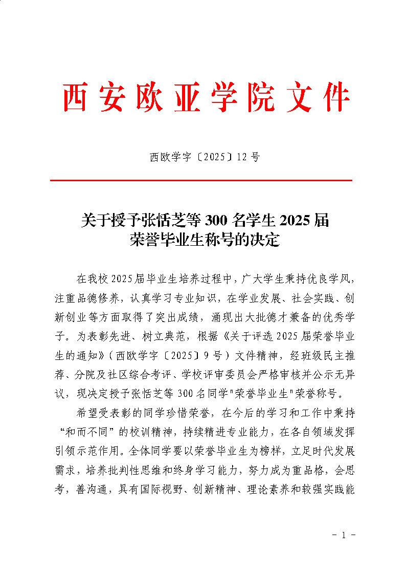 关于授予张恬芝等300名学生2025届荣誉毕业生称号的决定