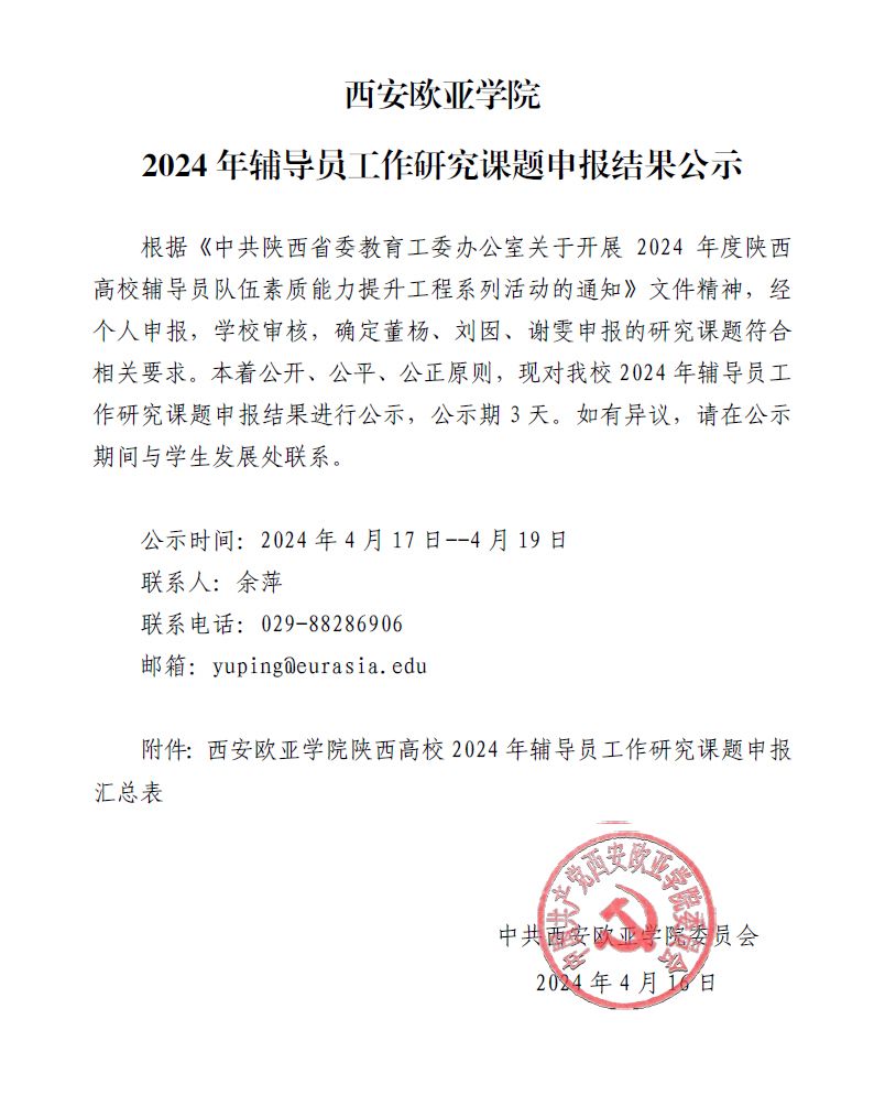 西安欧亚学院2024年辅导员工作研究课题申报结果公示