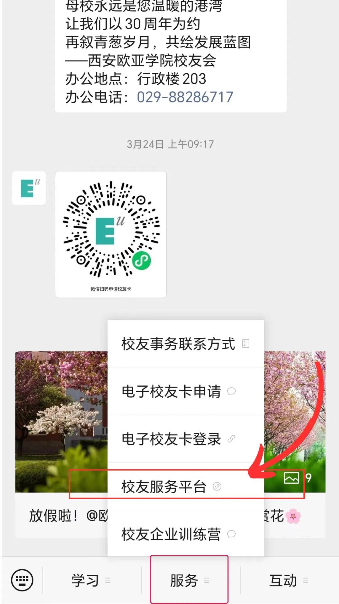 1.扫描二维码,关注”西安欧亚学院校友会公众号”