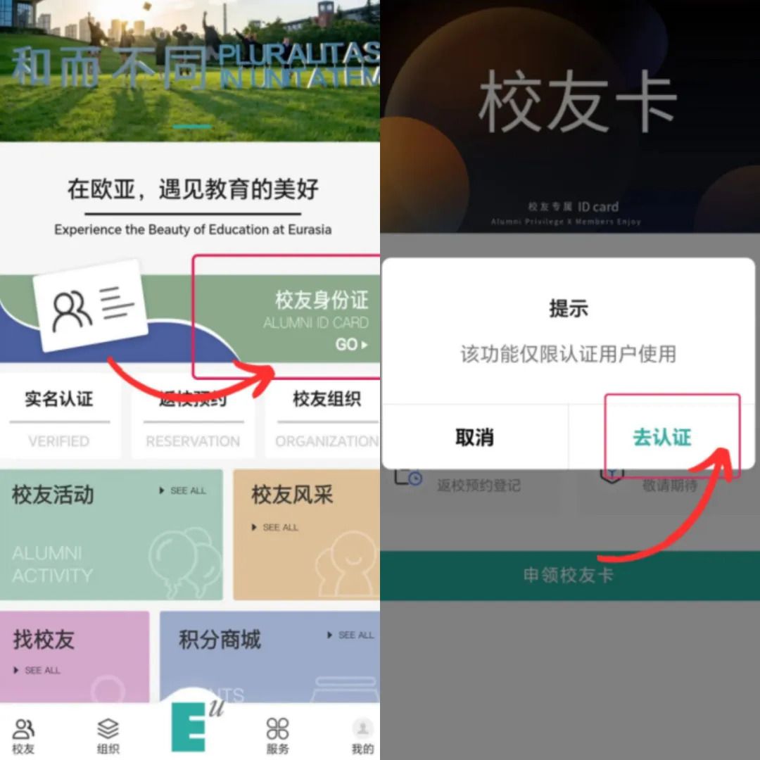 3.点击【校友身份证】、【去认证】。