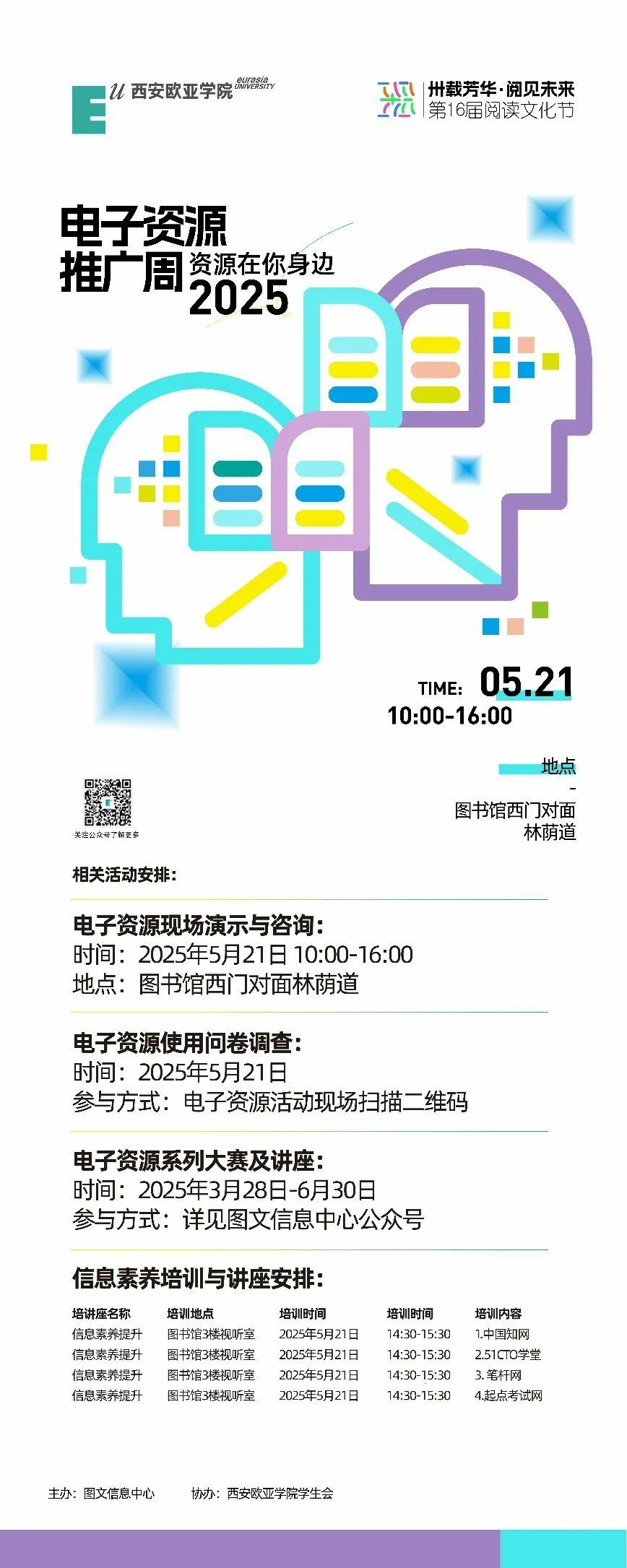 活动内容包括:中外电子资源现场演示与咨询;电子资源问卷调查;系列电子资源大赛及线上讲座;信息素养提升线下讲座;数据库线下培训等。