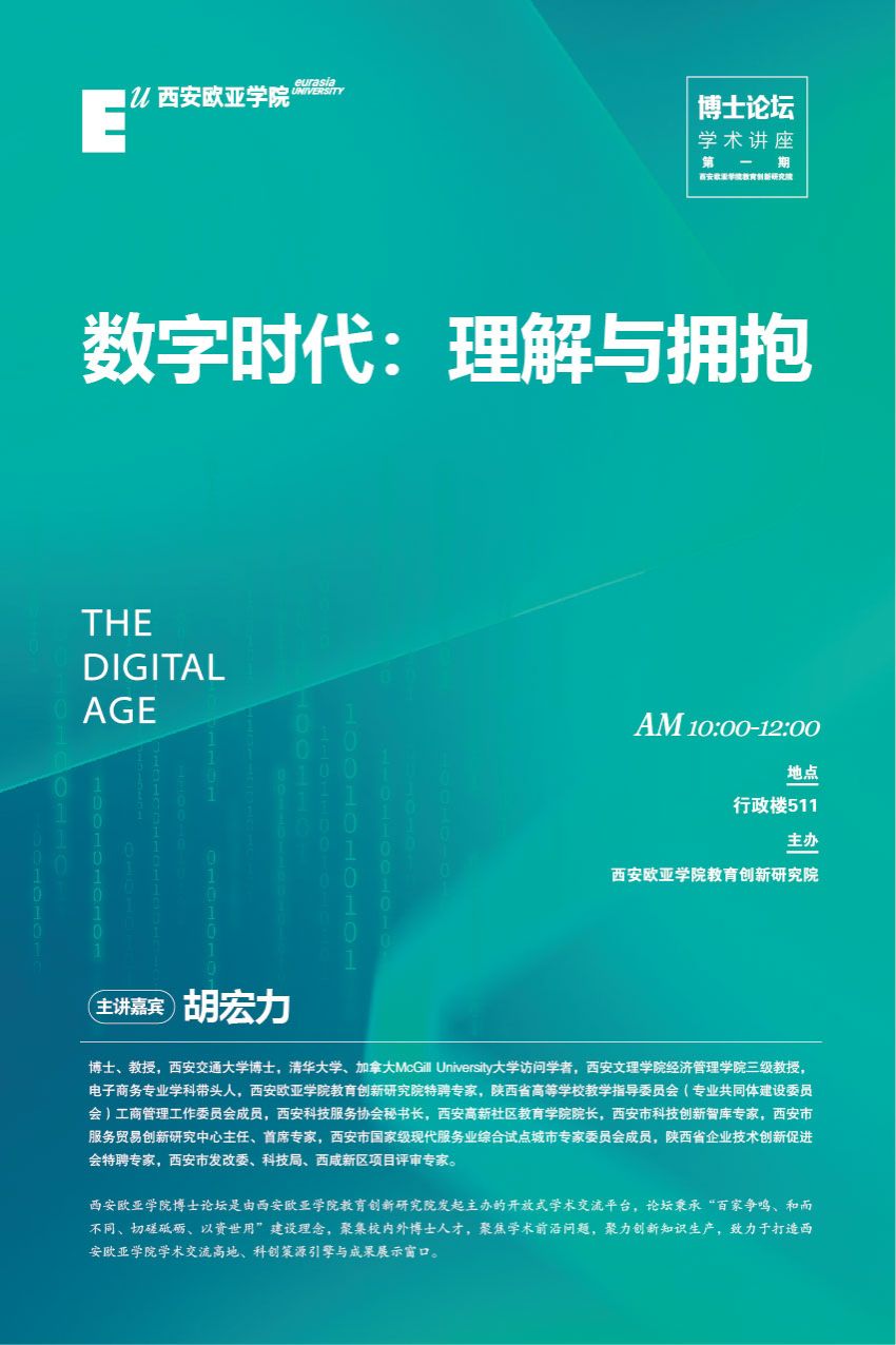 西安欧亚学院博士论坛首期学术讲座将于2023年5月10日上午10:00在行政楼511举办。讲座邀请西安文理学院三级教授、西安欧亚学院教育创新研究院特聘专家、西安高新社区教育学院院长胡宏力博士,以《数字时代:理解与拥抱》为题,围绕社会历史演进视野下的数字时代特征及影响、数字时代国家政策导向与学术研究动向解读、高校师生如何应对以及拥抱数字时代等重点内容进行知识分享和学术交流。