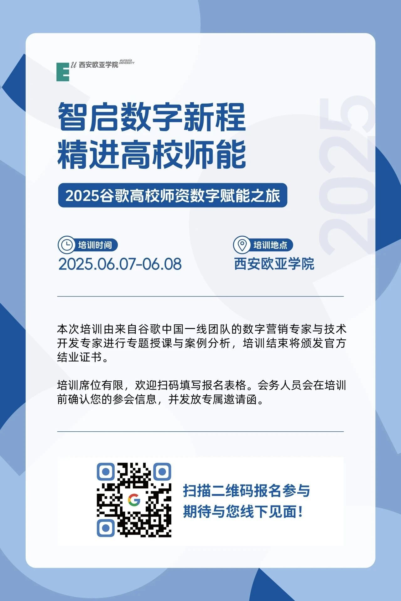 立足教育部"供需对接就业育人项目",西安欧亚学院持续践行 "以雇主为导向,以学生为中心" 的教育理念,遵循 "国际化、应用型、新体验" 的培养方针,深化产教融合、校企合作,推动人才培养与就业有机联动、人才供需有效对接。工商管理学院国际商务专业自2023年起,与谷歌深度开展教育部“供需对接就业育人项目”下的定向人才培养培训项目,连续输送师生参与谷歌数字人才培养计划并获得相关认证,积累了宝贵的合作经验。助力高校教师掌握前沿数字营销技能,打造具有国际竞争力的实践型数字营销人才队伍,谷歌中国将于今年6月首次落地西安欧亚学院,开展高校师资人才培训!诚邀您的参与!