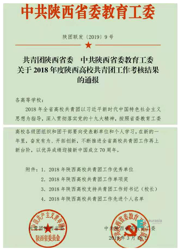 3月18日,共青团陕西省委办公室下发了《关于2018年度陕西高校共青团工作考核结果的通报》(陕团联发[2019]9号),我校团委荣获“新媒体和网络宣传工作先进单位”称号,校党委副书记、校长刘瑾教授荣获“2018年陕西高...