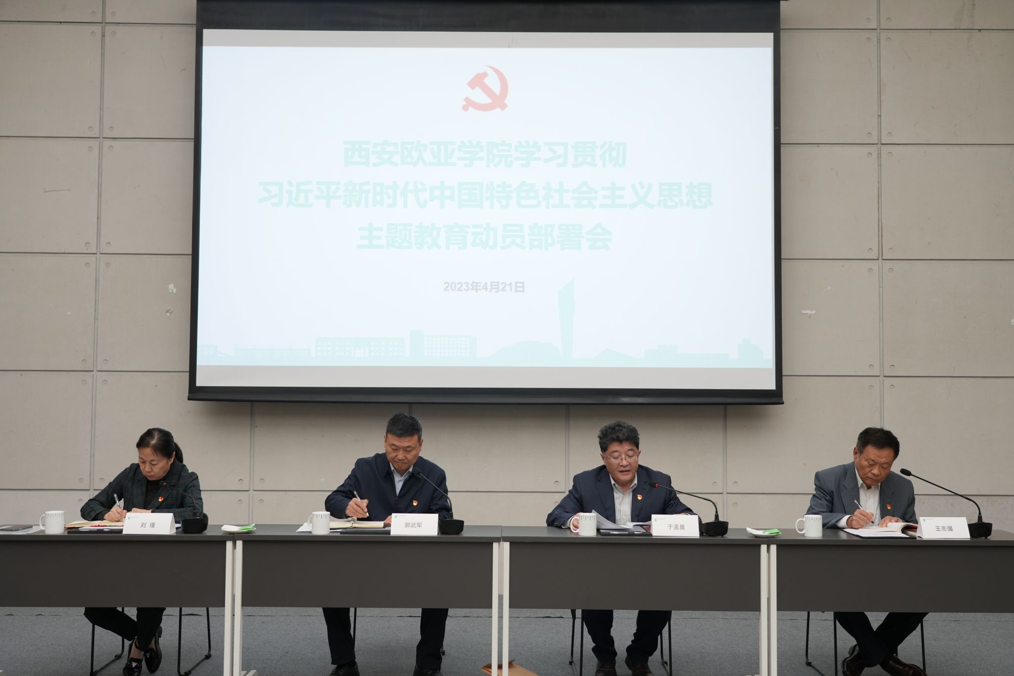 4月21日下午,西安欧亚学院召开学习贯彻习近平新时代中国特色社会主义思想主题教育动员部署会。校党委书记于孟晨同志作动员讲话,省委教育工委、省教育厅主题教育第二巡回指导组组长郭武军同志作指导讲话。会议由校党委副书记、校长刘瑾同志主持。党委书记于孟晨同志在动员讲话中指出,在全党开展集中教育,是我们党的优良传统和政治优势,是党推进自我革命的重要途径。扎实开展学习贯彻习近平新时代中国特色社会主义思想主题教育是我们最重要、...