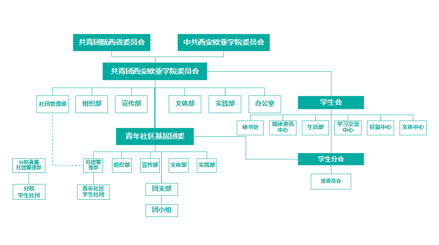 共青团西安欧亚学院委员会(以下简称“团委”)是在学校党委和上级团组织领导下开展工作的青年群团组织,负责指导学生会和统筹管理全校学生社团,下设办公室、组织部、宣传部、文体部、实践部、社团管理部6个直属工作部门,围绕立德树人根本任务,承担组织建设、思想引领、社会实践、校园活动、志愿服务、社团管理、骨干培养等专项工作,并在青年社区设立分团委。