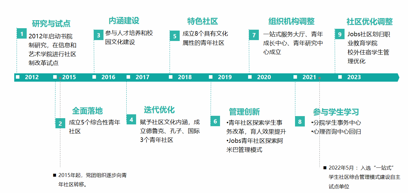 围绕立德树人根本任务,依托学生生活园区,推进党团组织、管理部门、服务单位进驻青年社区开展工作。将青年社区打造成为集学生思想教育、师生交流、文化活动、生活服务于一体的教育生活园地。