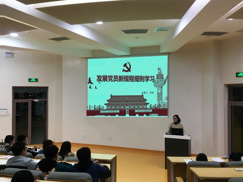 为了贯彻落实《中国共产党发展党员工作细则》的精神和要求,进一步让积极分子们了解规范党员发展工作、严格党员发展程序,提高党员发展质量,2019年11月5日晚19:30,第二青年社区分党委支部书记马丹同志进行了“不忘...